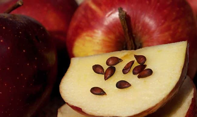 Las pepitas de manzana también contienen cianuro, la cantidad de una sóla manzana no produce ningún efecto